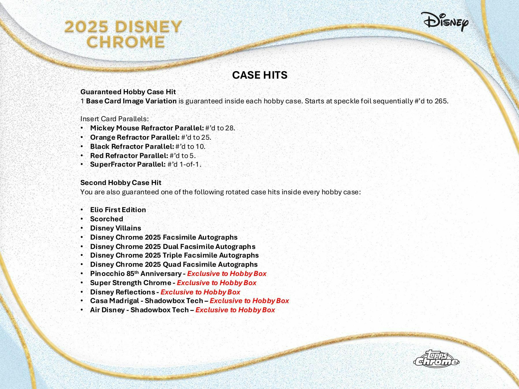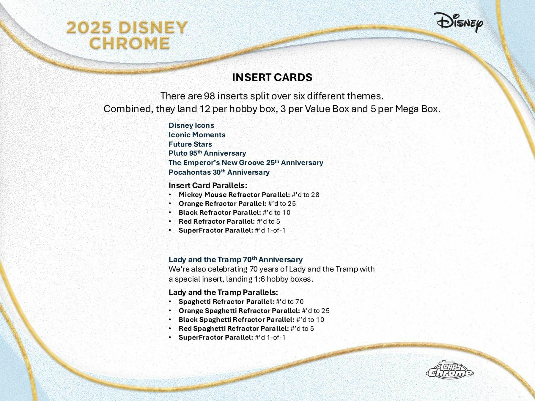 Collect the 200-card base set on stunning Chrome tech. All your favorite Disney and Pixar characters are here - plus, for the first time, look for base cards of Disney Live Action heroes. Also look out for special inserts and incredible sketch cards. This, plus much more, in 2025 Disney Chrome!