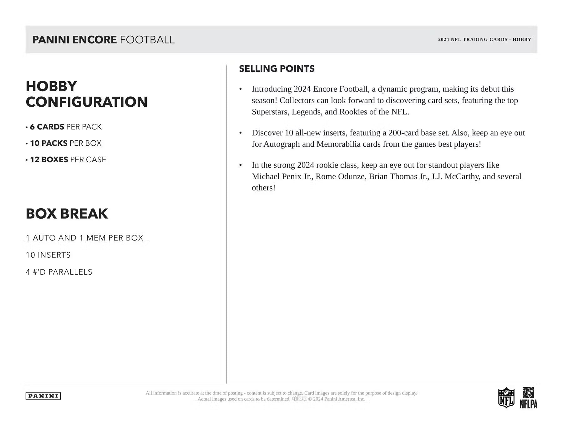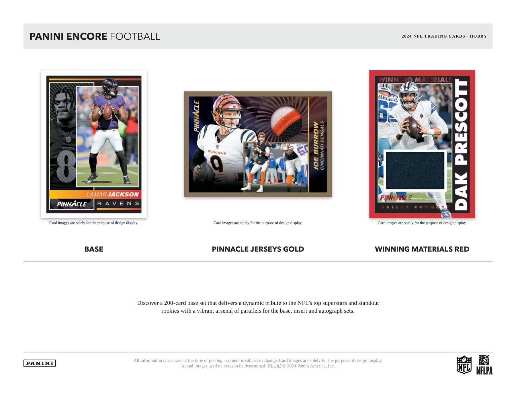 Panini Encore Football debuts with an exciting lineup of inserts, including Pinnacle Showcase, Panini Choice and 2024 Rookies!