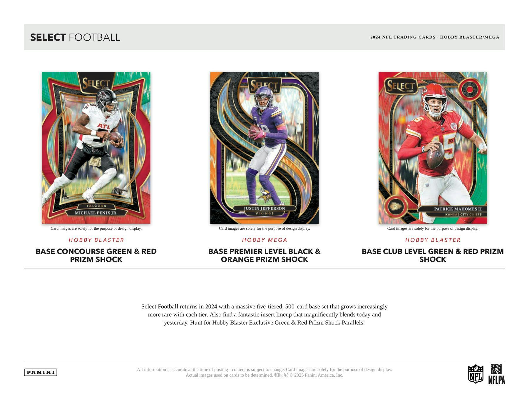 Select Football returns in 2024 with a massive five-tiered, 500-card base set that grows increasingly more rare with each tier. Also find a fantastic insert lineup that magnificently blends today and yesterday. Hunt for Hobby Blaster Exclusive Green & Red PrIzm Shock Parallels!