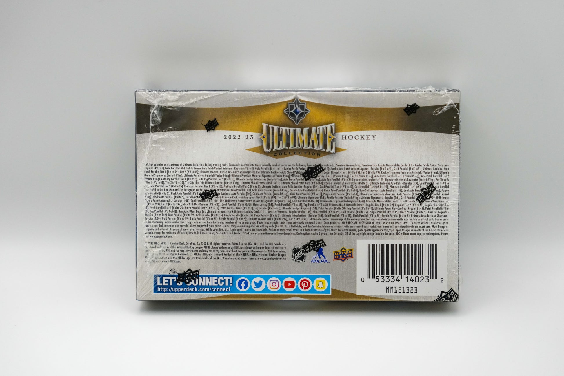The 2022-23 Upper Deck Ultimate Collection Hockey Hobby Box delivers some of the most high-end autographs and memorabilia cards in the hobby. Known for its elegant designs, hard-signed rookie autographs, and oversized patch content, Ultimate Collection is a collector favorite for premium hits.